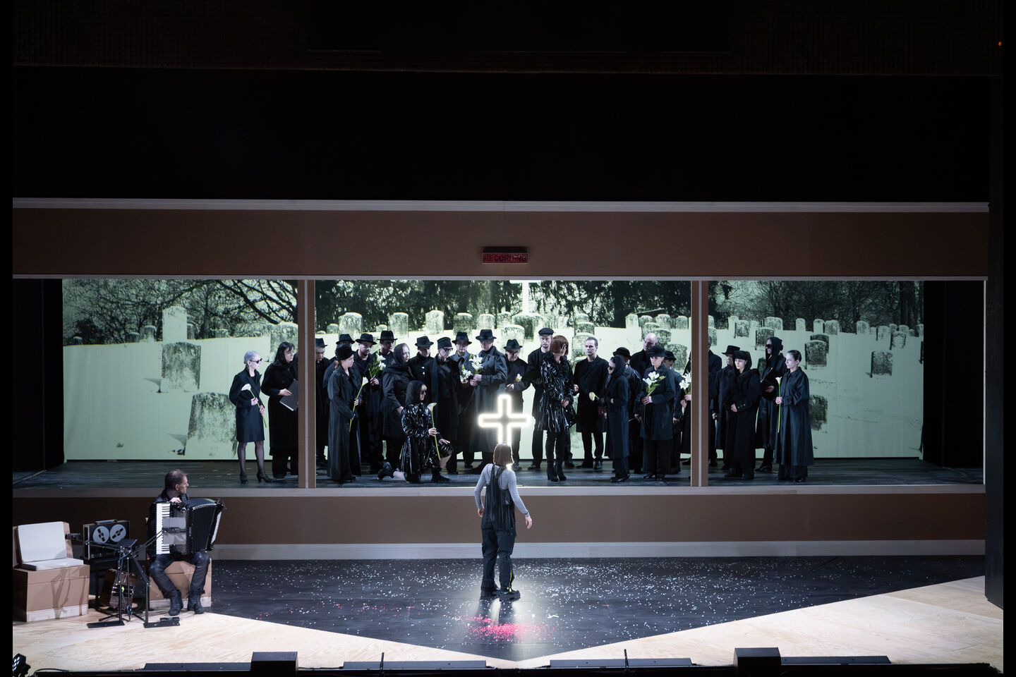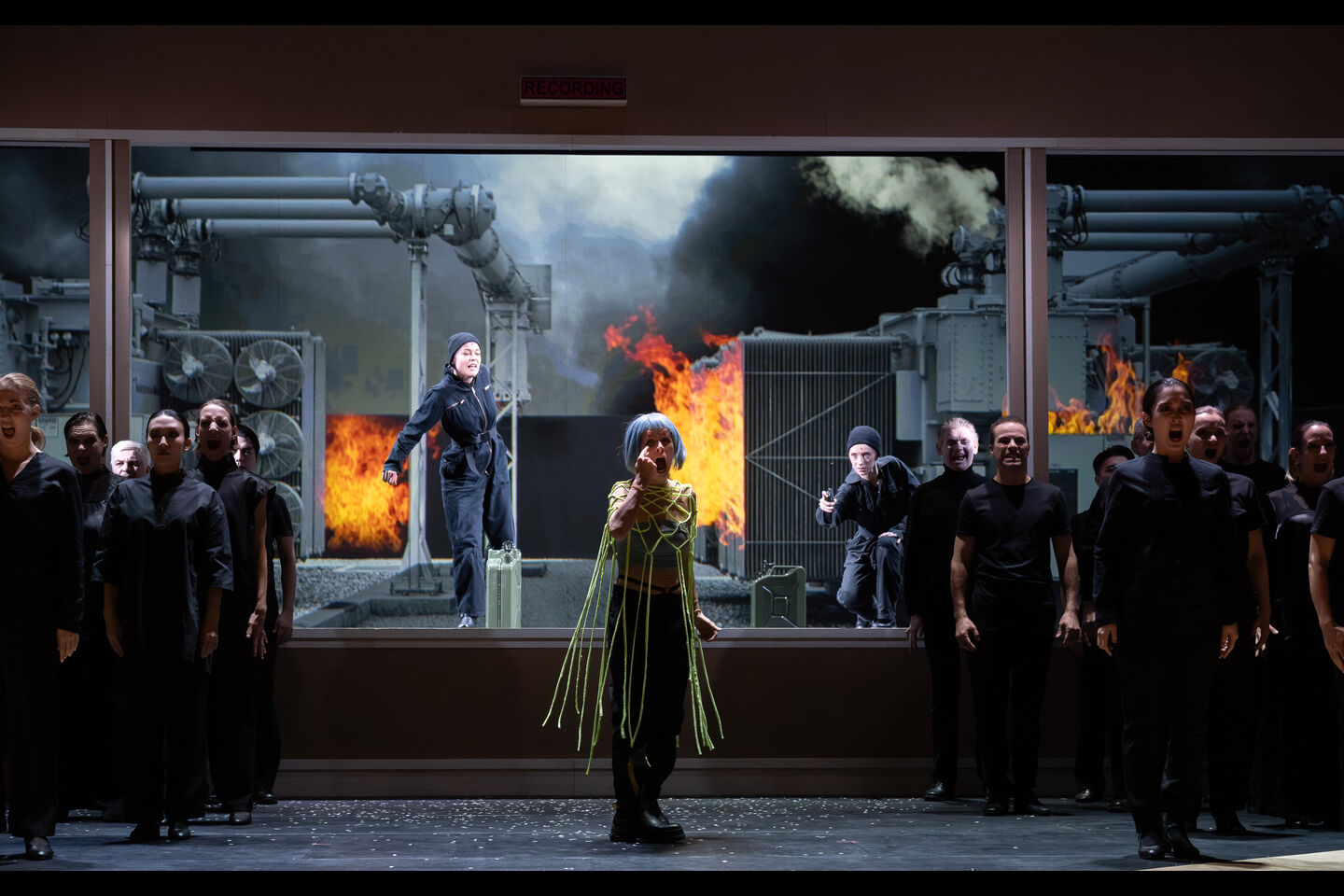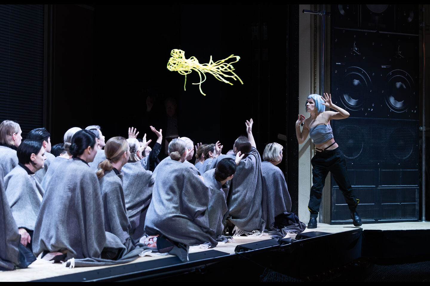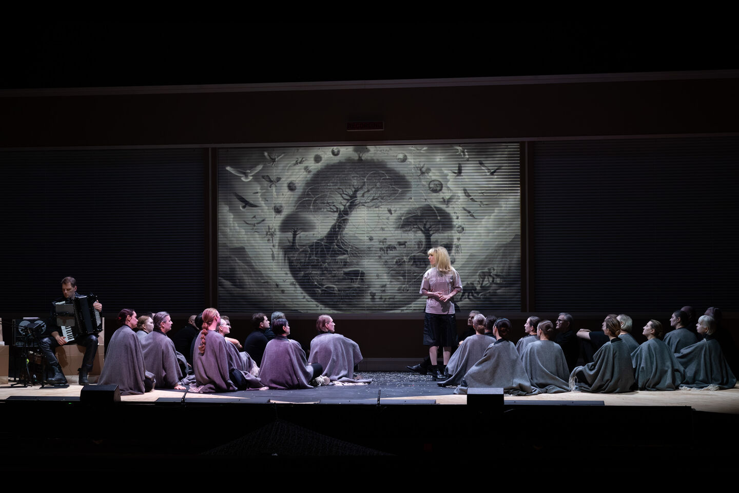 In AscheMOND oszillieren verschiedene Zeit- und Ausdrucksebenen: Stille, Visualität und Klang treten zueinander in Beziehung. Dabei umkreisen die durch Oehring modern übermalten Purcellschen Barocksongs und seine eigene vielgestaltige Musik einander wie Planeten. Die gehörlose Schauspielerin und Tänzerin Kassandra Wedel verkörpert die Fairy Queen in einer durch den Komponisten choreografierten Gebärdenpoesie, die nicht nur ihre, sondern auch die Partien der Sänger*innen und des Chores prägt.