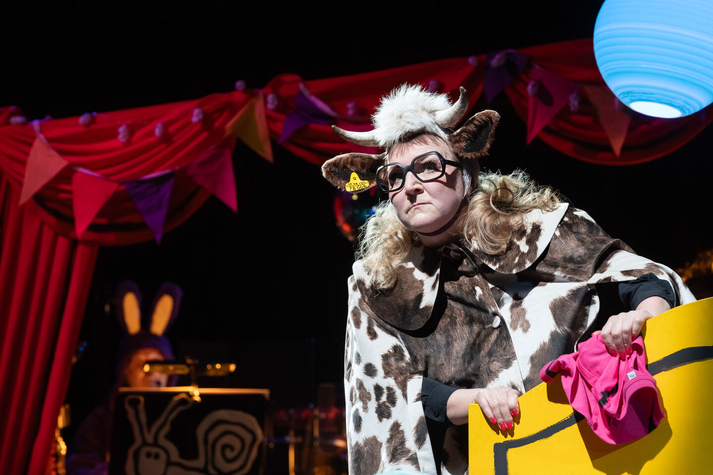 Claudia Federspieler hat das Bilderbuch (in dem das Hornvieh noch Rosalinde heißt) auf musikalisch fantasievolle Klangfüße gestellt und ein heiteres Stück Musiktheater für alle ab 5 Jahren erdacht. Mit nur zwei Sänger*innen werden die Figuren und die Geschichte auf der Bühne lebendig. Unterstützt werden sie dabei von vier Musiker*innen, die starke Sounds u. a. von Akkordeon und allerlei Schlagwerk beisteuern. Kuhglocken dürfen dabei natürlich auch nicht fehlen.